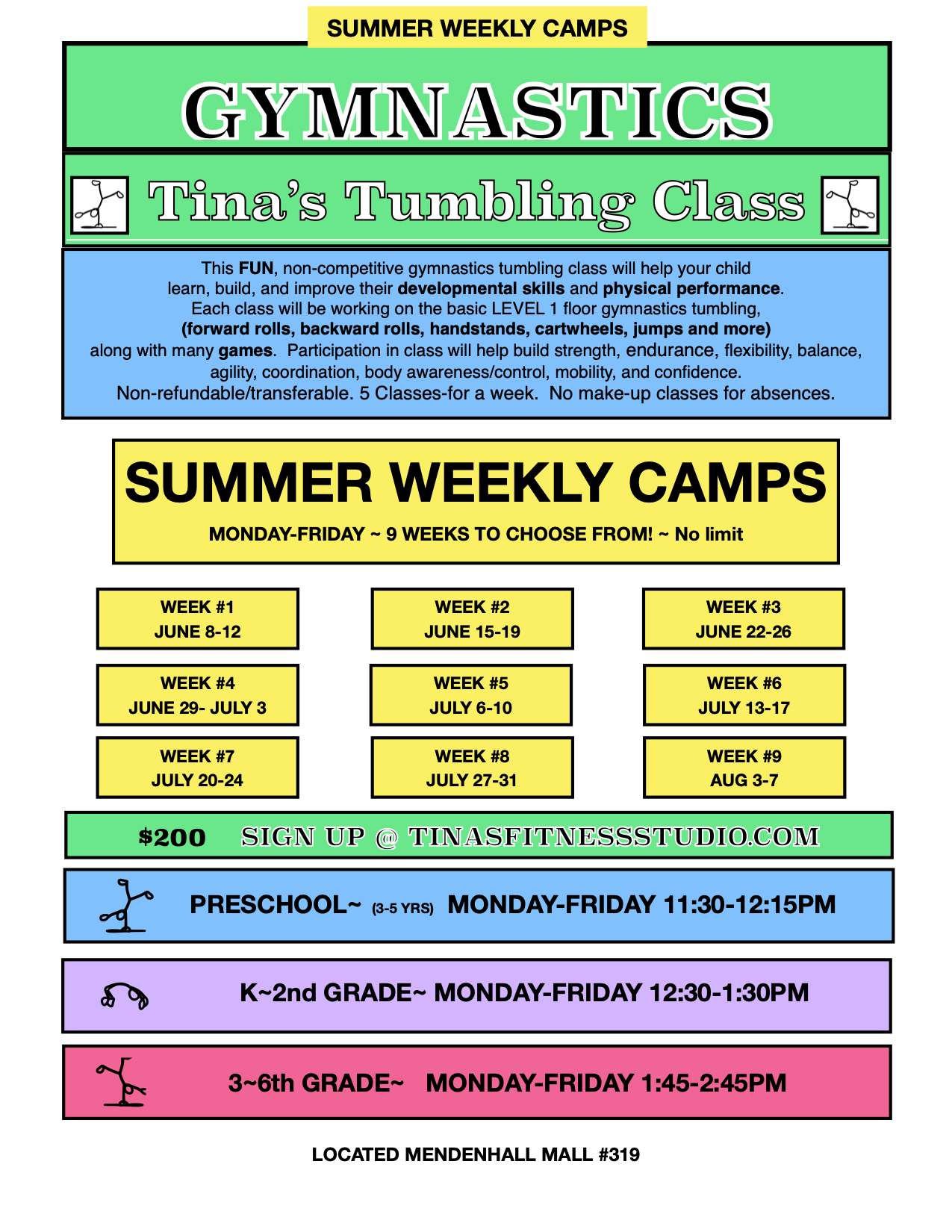 TINA’S TUMBLING~ SUMMER WEEKLY CAMPS! SIGN UPS NOW OPEN